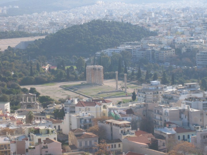 (Looking down from Acropolis, also note behind the temple is the stadium from the first modern Olympics held in Athens in 1896)