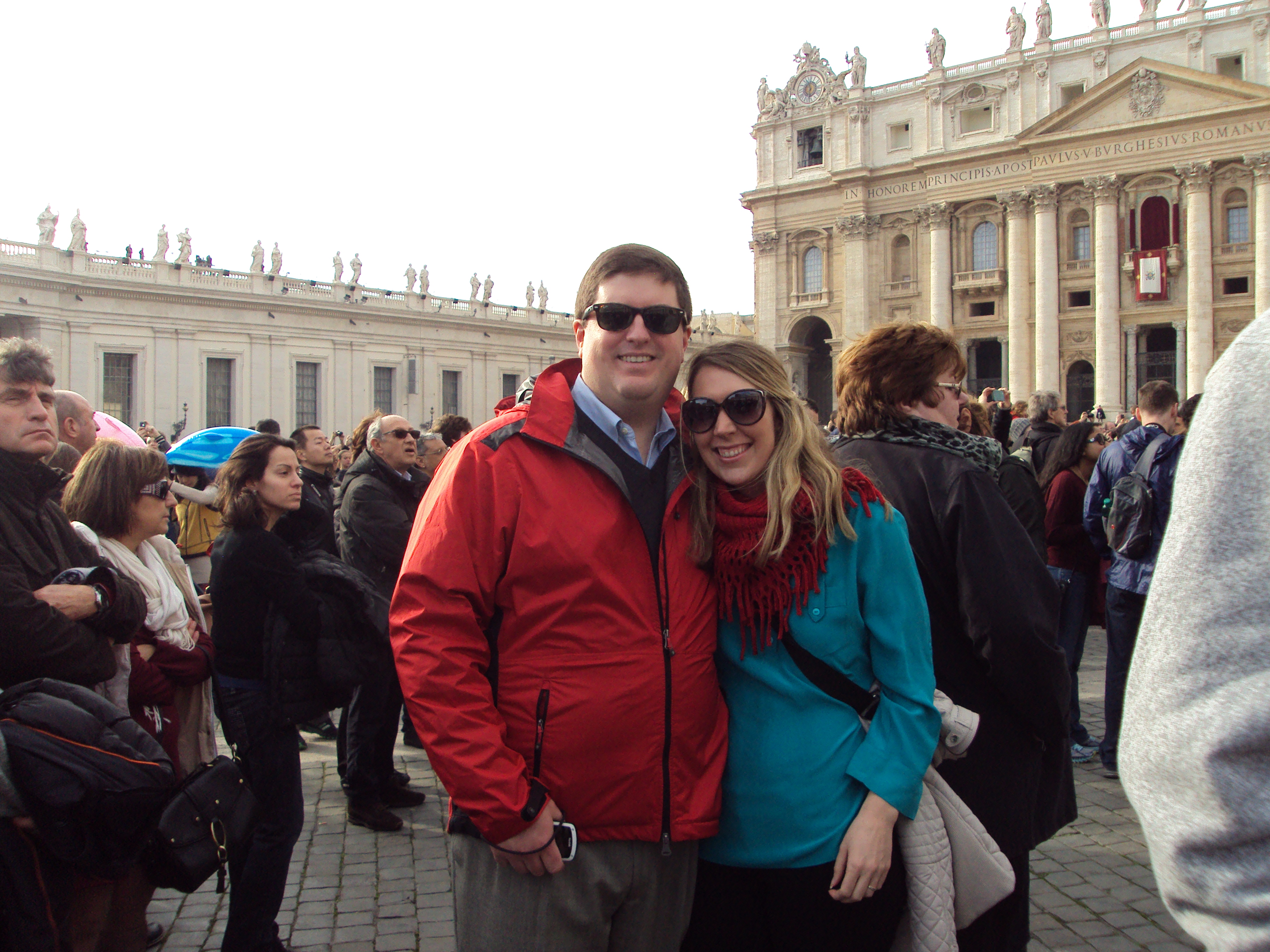 We met outside of the walls and walked as a group into St. Peter’s Square finding it to be less crowded than we initially had feared (still about 30-40 minutes before his speech). We managed to get within 10-15 people of the northwest corner barricade, all-in-all a really good spot to watch. As the time for his appearance and address approached the square became more and more crowded, to the point that it was filled out to the very edges. Pretty neat to be as close as we were. (I should clarify that I am not Catholic but do find it very neat to witness events like this)