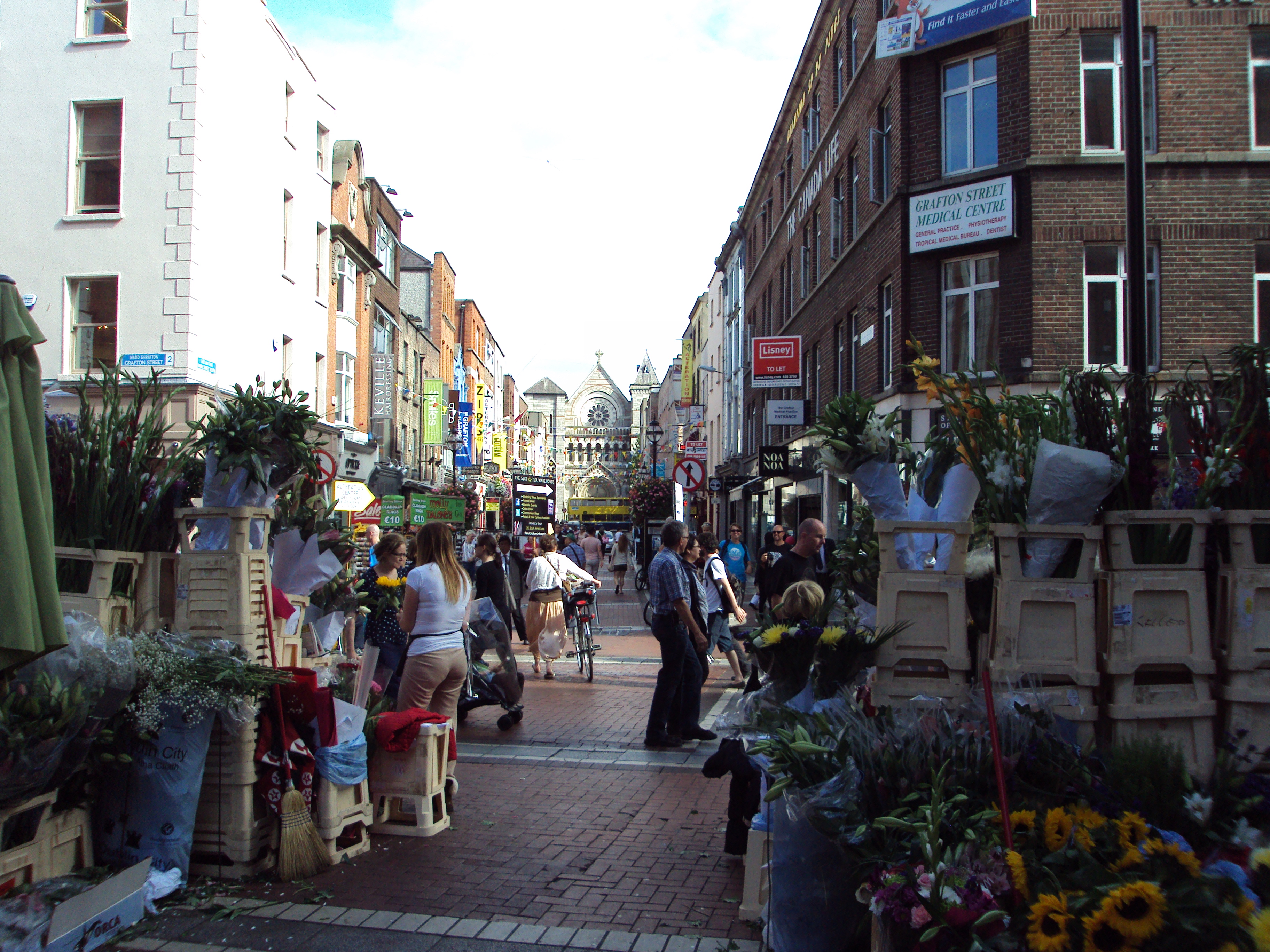 Grafton Street viewed from side street (Pedestrian shopping street with good street performers)